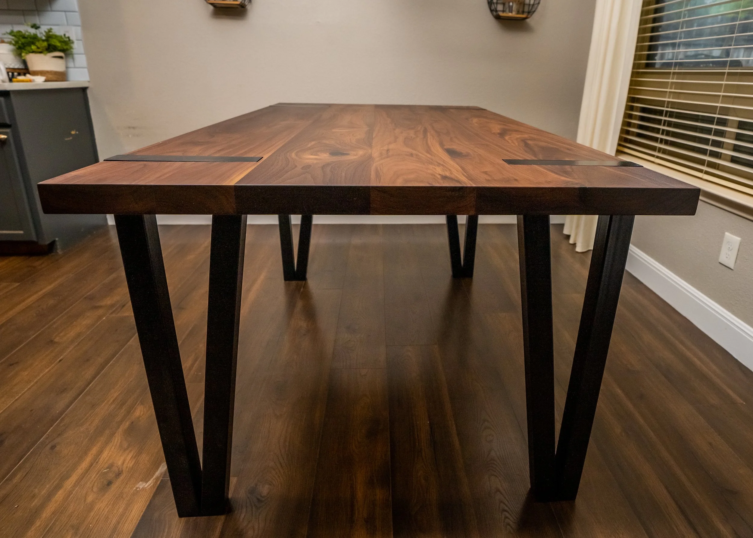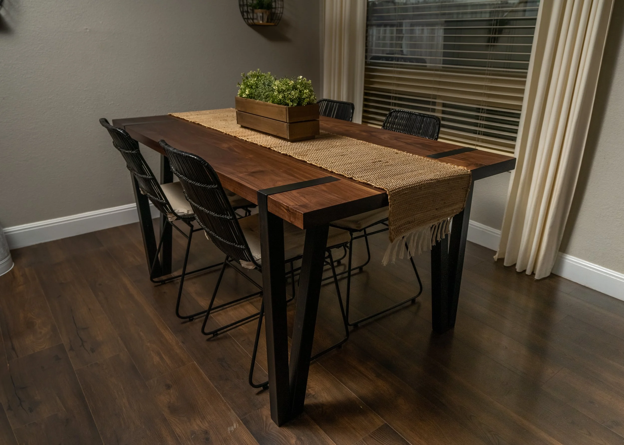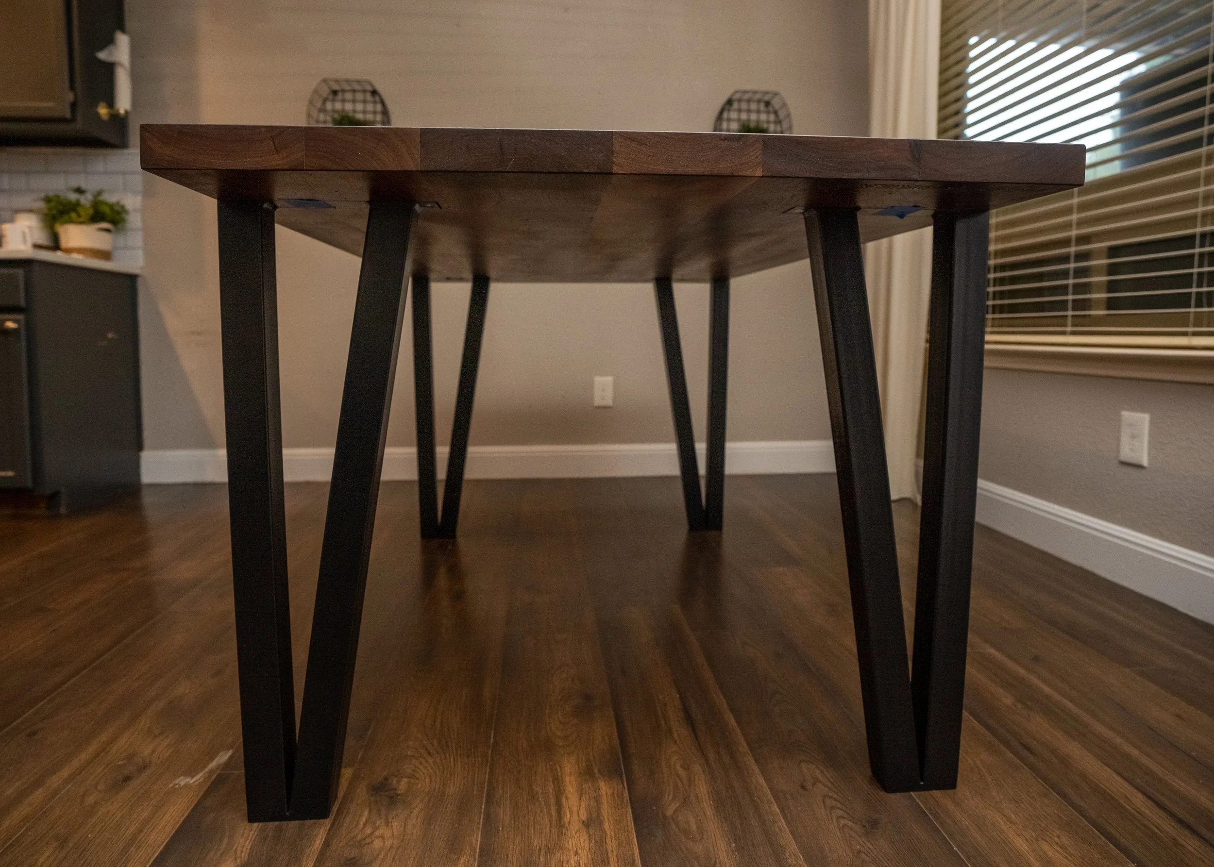 These metal legs add an industrial touch to a modern top. Each leg is inlaid into the 1.75” top to provide a flush and unique surface. Legs can be removed for ease of moving.