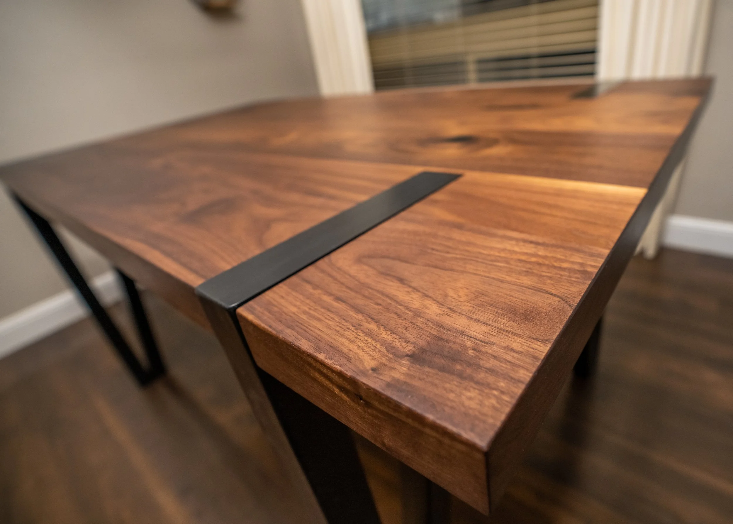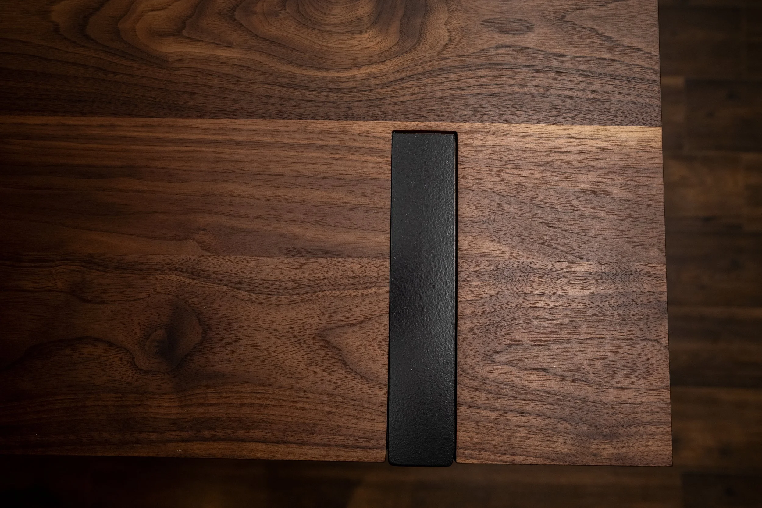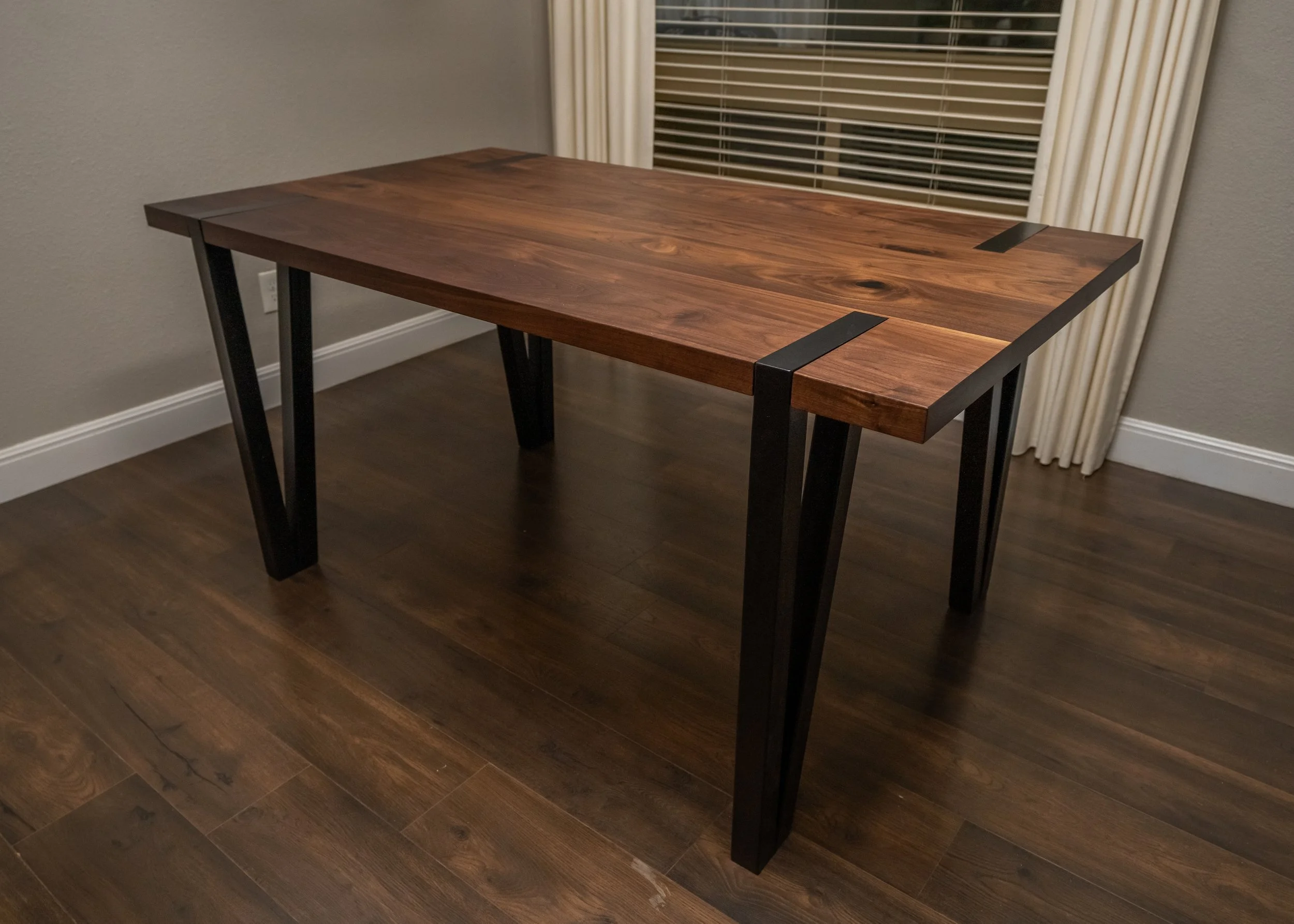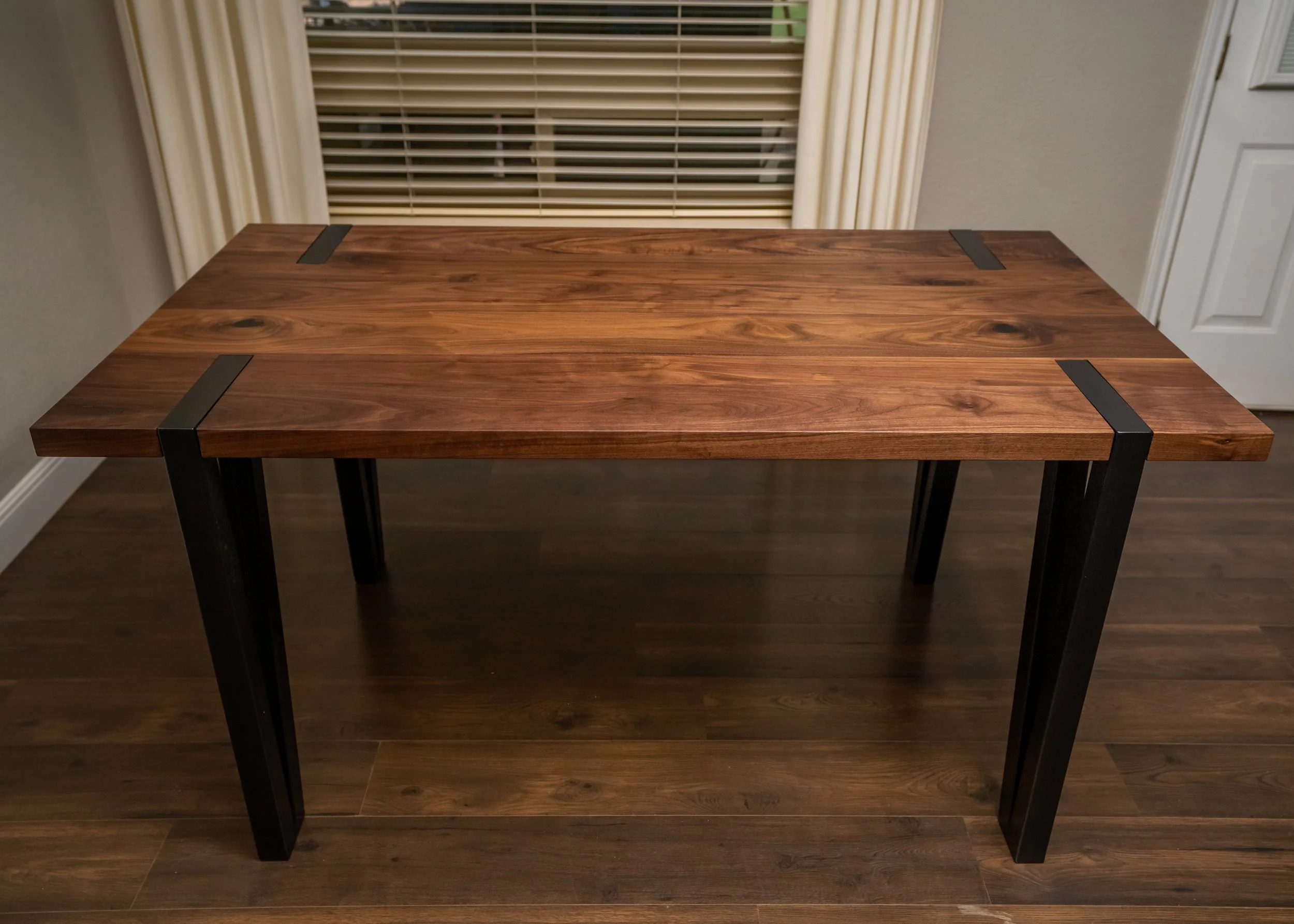 These metal legs add an industrial touch to a modern top. Each leg is inlaid into the 1.75” top to provide a flush and unique surface. Legs can be removed for ease of moving.
